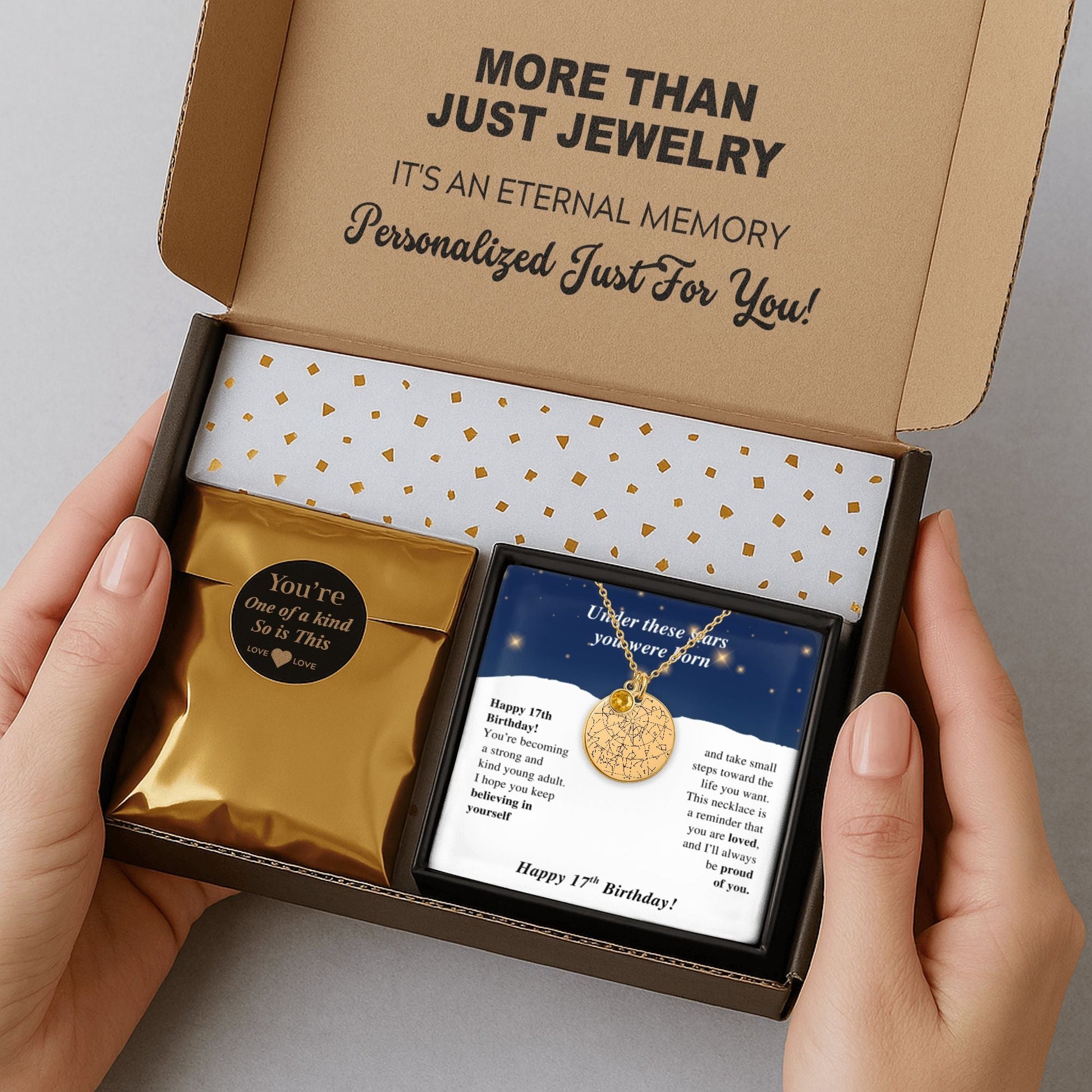 This necklace captures her birthday's night sky, turning it into a daily reminder of her uniqueness and growth.